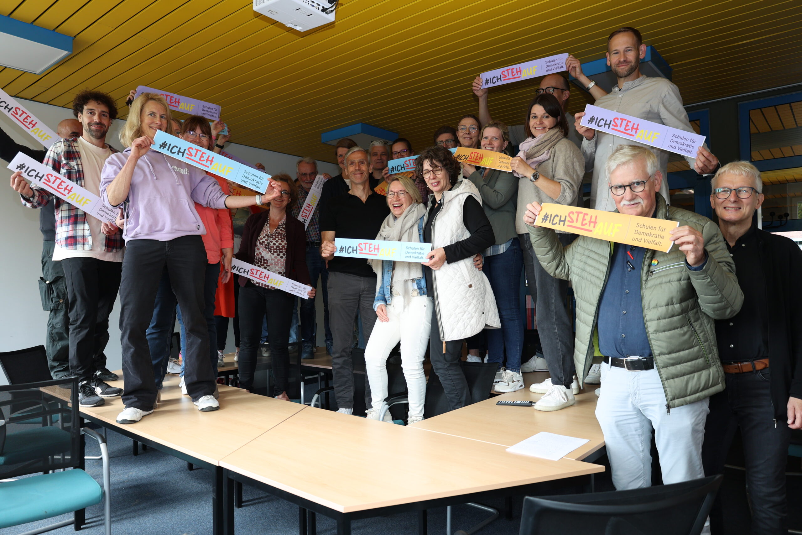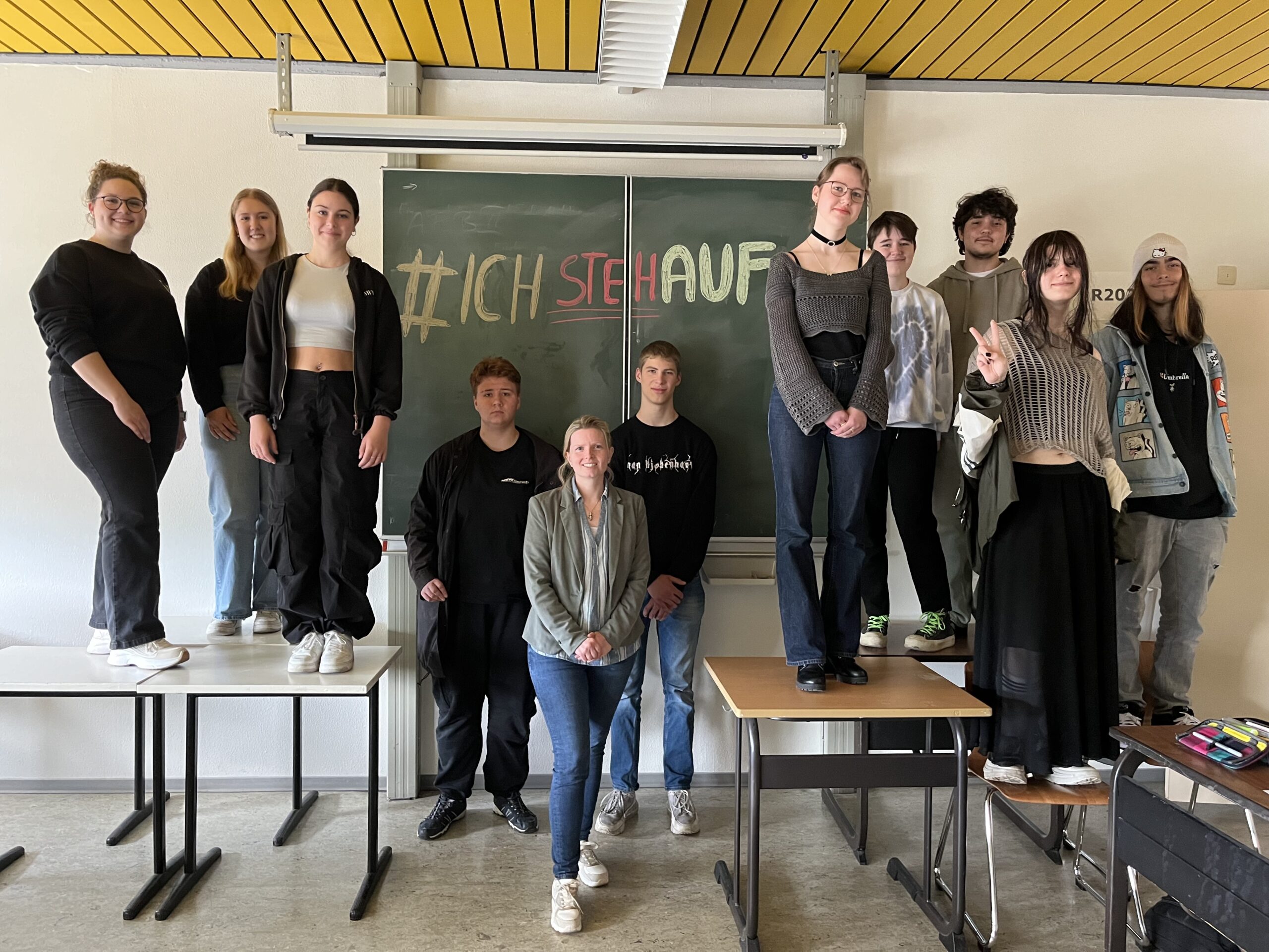 Bewusst und sichtbar hat das Paul-Spiegel-Berufskolleg ein Zeichen gesetzt für Demokratie und Vielfalt. Mit kreativen Ideen haben sich Schülerinnen und Schüler aus unterschiedlichen Bildungsgängen sowie Lehrkräfte am 6. Juni am Aktionstag der Initiative #IchStehAuf – Schulen für Demokratie und Vielfalt beteiligt. Sie formierten sich gegen Ausgrenzung und für Vielfalt auf dem Schulhof, inszenierten Choreographien in der Aula, stiegen auf Tische und Bänke in Klassenräumen oder – wie der Schulleiter – dem Berufskolleg aufs Dach. Die Aktionen waren bunt, mit viel Engagement vorbereitet und umgesetzt. Sie verstehen sich als Beiträge, um das Bewusstsein für Demokratie und gegen Hass und Gewalt im gesamtgesellschaftlichen Zusammenhang, aber insbesondere auch im persönlichen Handlungsraum von Schule und Privatleben zu stärken.
