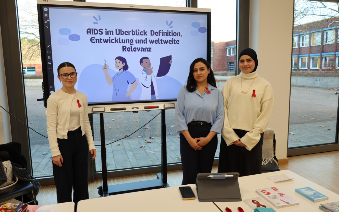 Die Oberstufe der Fachoberschule für Gesundheit und Soziales des Paul-Spiegel-Berufskollegs Warendorf möchte ihren Beitrag zur Prävention leisten und hat wie jedes Jahr auch im letzten Dezember zum Welt-AIDS-Tag einen Informationstag für die Schulgemeinschaft veranstaltet. Im Vorfeld haben sich die Schülerinnen und Schüler der Klasse FOSO1 mit den Themen HIV und AIDS in einer Projektarbeit beschäftigt und Informationen für interessierte Klassen zusammengestellt. Diese präsentierten sie an verschiedenen Ständen im Selbstlernzentrum des Berufskollegs. Unterstützt wurden die Schülerinnen und Schüler von Fachlehrerin Angelika Flinkert, Mitarbeiterinnen des Gesundheitsamtes des Kreises Warendorf und der AIDS-Hilfe Ahlen. Aufklärung ist ein wichtiges Puzzleteil von Prävention. Wenn Jugendliche und junge Erwachsene über die Gefahren der Infektion und mögliche Schutzmaßnahmen informiert sind, können sie sich selbst und andere schützen. Die FOSO1 informierte über Risikogruppen, Übertragungswege, die weltweite Verbreitung des Virus, Testverfahren und Präventionsmaßnahmen.