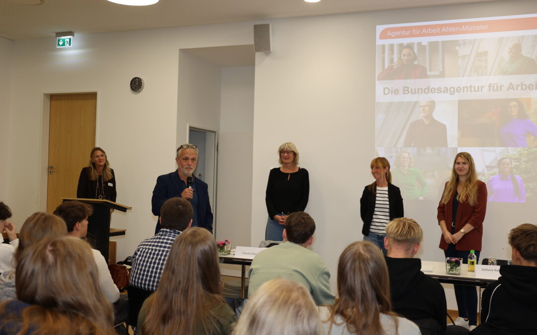 Schulleiter Udo Lakemper eröffnete die Infoveranstaltung mit den Referentinnen von der Agentur für Arbeit Claudia Mann, Stefanie Nahrmann und Katharina Leusing (3., 4. u. 5. v.l.) Ganz links im Bild Gisela Mersmann, Studien- und Berufswahlkoordinatorin am Paul-Spiegel-Berufskolleg