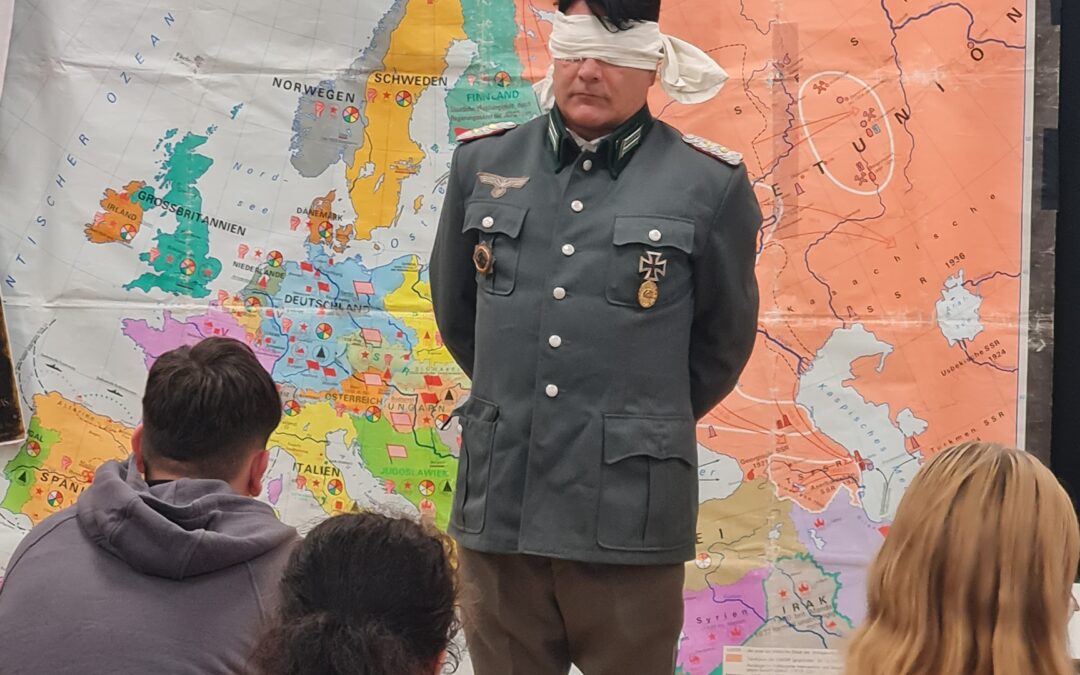 Den Auftakt machte ein Gastspiel der Kulturschule Leipzig. Die Ensembles der Einrichtung sind bundesweit unterwegs, um in Schulen zu spielen. Mit dem Stück „Stauffenberg“ beleuchtete das Theater die historische Person Claus Schenk Graf von Stauffenberg und das gescheiterte Attentat gegen Adolf Hitler am 20. Juli 1944. Günther Frese (verantwortlich für Organisation und Schauspiel) ließ die Schülerinnen und Schüler mit seiner Darstellung der Figur in eindrucksvoller Weise an dessen Gedankenwelt, Handlungen und Schicksal teilhaben. In den Spielszenen übermittelte er Motive und Gewissensdilemmata von Stauffenbergs in dessen widerstreitenden Rollen als hochrangigem Offizier der deutschen Wehrmacht einerseits und zentralem Mitglied einer bedeutenden Widerstandsgruppe gegen den Nationalsozialismus andrerseits. Daniela Frese (Regie und Schauspiel) erklärte in ihrer Rolle als Moderatorin den geschichtlichen Kontext zum besseren Verständnis des Stücks. Eingespielte historische Original-Audioaufnahmen, z.B. von Soldatenvereidigungen und Ansprachen Adolf Hitlers, verliehen der Inszenierung einen besonderen Nachdruck. Nach der Aufführung erläuterte Daniela Frese weitere Hintergründe, etwa die nachfolgende Rezeption des Attentats in der Bundesrepublik, und spannte den Bogen hin zum heutigen politisch-gesellschaftlichen Diskurs über Demokratie, Meinungsfreiheit und Respekt. Als Ergänzung zur Thematik des Theaterstückes konnten Schülerinnen und Schüler mit VR-Brillen, vom Medienzentrum des Kreises Warendorf zur Verfügung gestellt, einen 3D-Rundgang durch das Anne-Frank-Haus in Amsterdam machen.